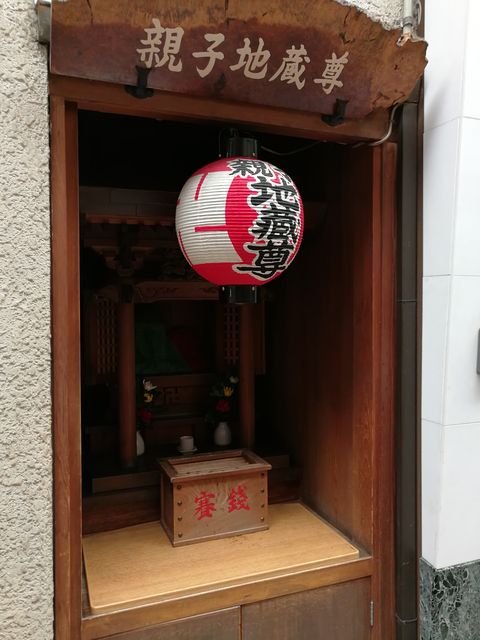 粉浜商店街の5番街の壁に、お堂が埋め込まれている。お地蔵さんの名前は親子地蔵尊。