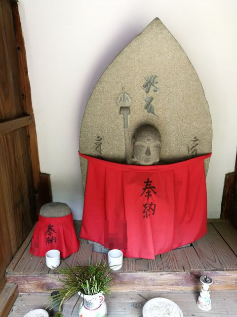 後日、日を改めて写真を撮り直しに行ったところある事実に気づいた。お堂の右端の二体のお地蔵さんの前掛けが外れていて、よくよく見ると、左側の石の塊に見えたお地蔵さん、首から上がない。