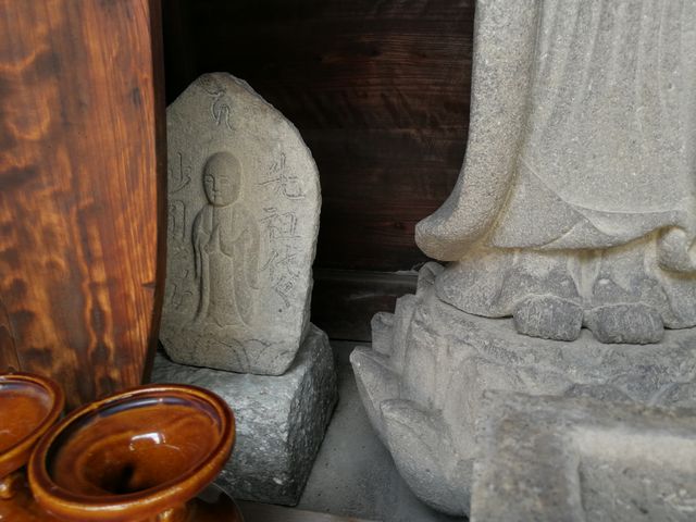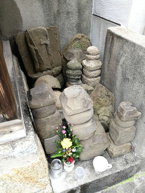 医院を建てるときに、塔や石像を前にだしてあげようとお堂の裏に集めて、花を供えている。
