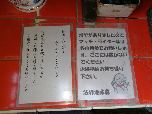 東住吉区019:東住吉区山坂3-7のお地蔵さん 紅玉 東住吉区 2017年10月8日 遠目にもよくわかる立派なお堂だ。お地蔵さんの名前は法界地蔵尊。 法界地蔵尊のいわれ。 注意書きにあるお地蔵さんのイラストがまた可愛い。 共有: X で共有 (新しいウィンドウで開きます) X Facebook で共有 (新しいウィンドウで開きます) Facebook いいね 読み込み中… 関連 公開済み 2017年10月8日