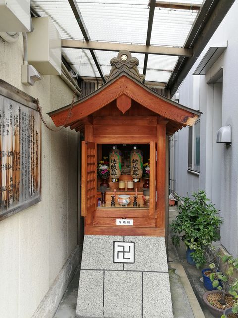 近鉄南大阪線矢田駅前にある矢田駅前交番とその西側日本レザークリエイトの間にお堂が建てられている。