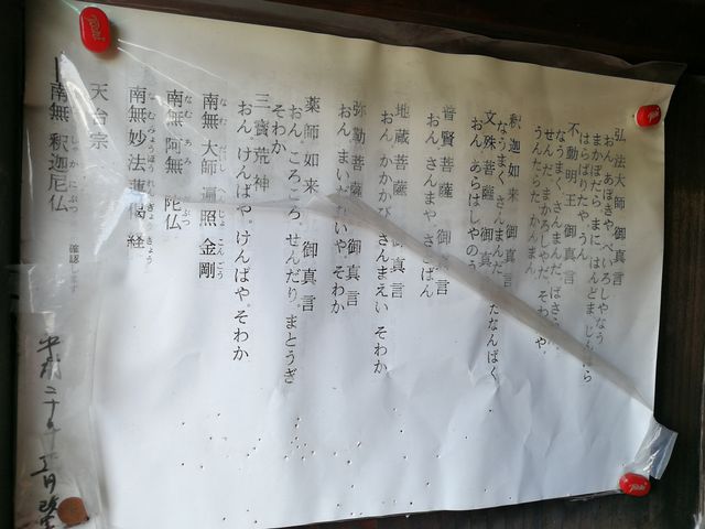 お堂内に貼られたご真言、たくさんの神仏が一緒に祀られている。