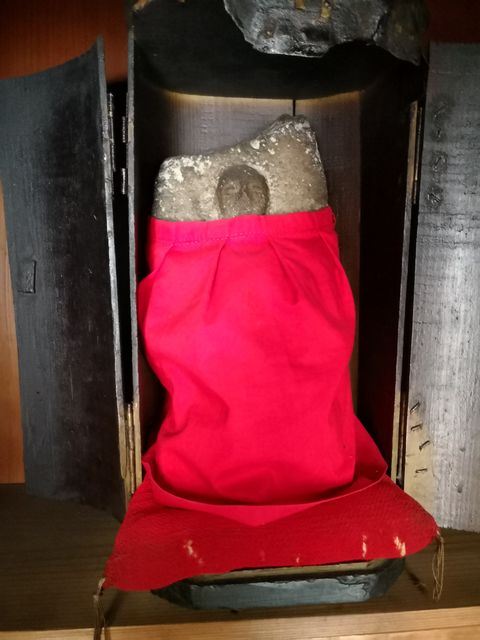 本田4-5と4-6の境界線上の路地を入った中程、4-5側にお堂を発見。ブルーシートに覆われている。手前のテーブルの下にあるのは井戸。