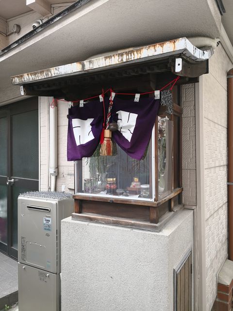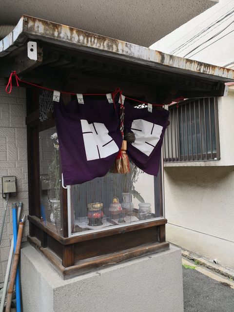 路地はいった民家の前に、北向きにお堂が建てられている。前と側面はアクリル板で覆われていて、全面は横にスライドして開けられた。