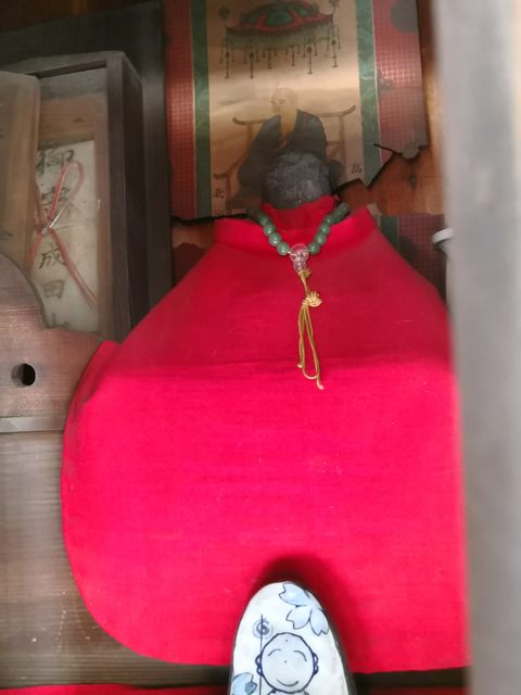 お供え物に気をつけて、扉を少し開けると、お地蔵さんと背後には弘法大師の掛け軸、成田山のお守りも祀ってある。お地蔵さんは緑の数珠を首に下げている。