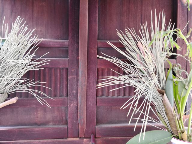 お花やお水のお供え物の奥には木の扉がある。
