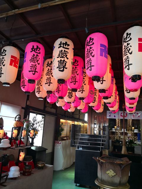 建物の中には、地蔵尊の提灯がたくさん掲げられている。
