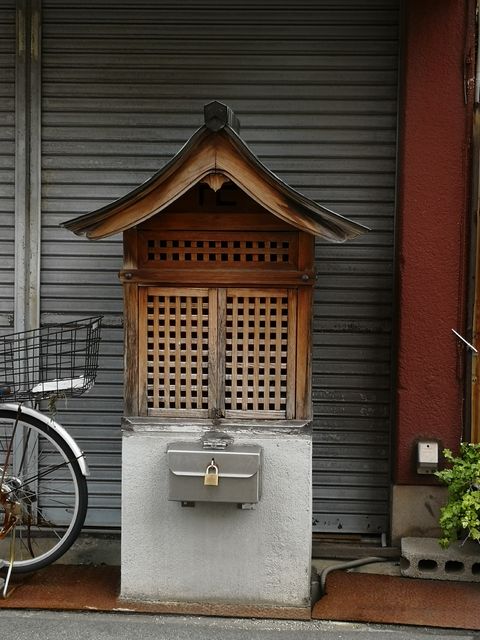 森永カルダスの看板がかかった店の前にお堂がある。