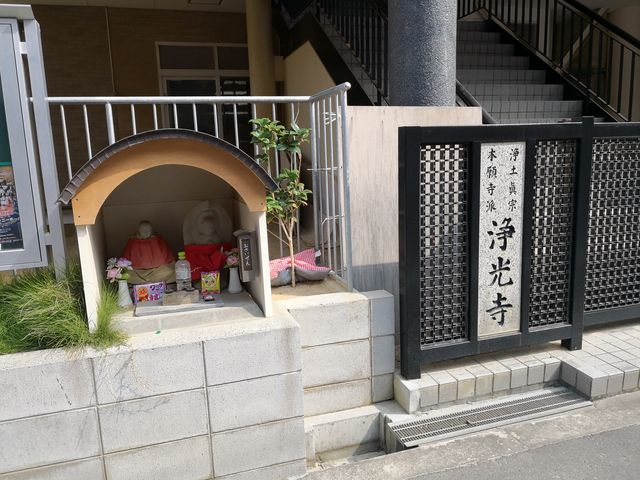 浄土真宗本願寺派浄光寺とその併設のアソカ学園の門扉の間にある。