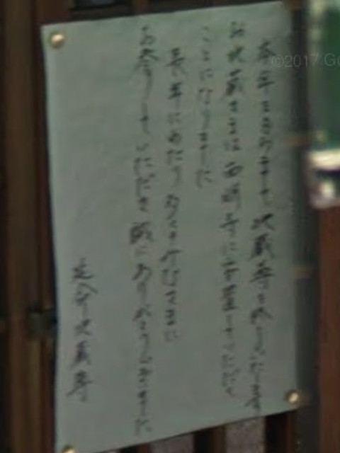お堂の張り紙を拡大すると、「今年を持ちまして地蔵盆を終了します。西明寺に安置させていただきます」との告知だった。ここに祀られていたのは延命地蔵尊だった。