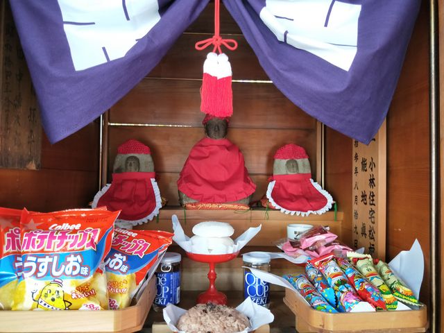 市営小林団地3号棟の西南角に、大きな覆屋の下にお堂がある。伺ったのはちょうど地蔵盆の頃だったので、飾り付けられていた。