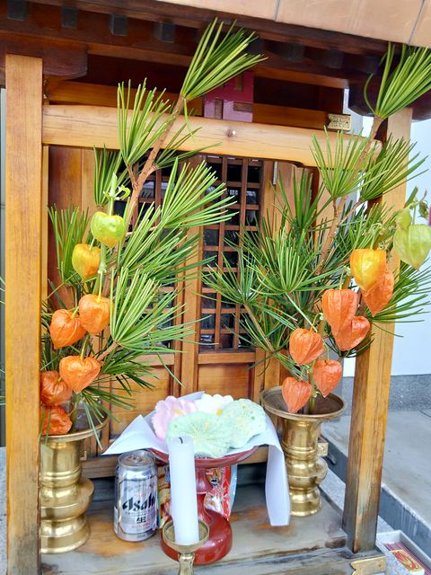 金ぴかの屋根につやつやした木造のお堂。地蔵盆のころだったので、鬼灯も飾られていた。