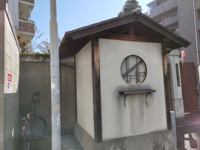 天満1-1という番地があまりに広い範囲で見つけ出すのに苦労した。造幣局の周囲を歩いて、かなり南の方まで来た時、やっと見つけた。造幣局南C棟のある辺り、塀の外に古風な覆屋がある。
