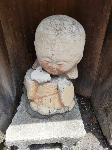 近づいてみると、お地蔵さんはバラバラになったものを、積み上げてある状態。上記のブログでは、JR天満駅からの写真で、お地蔵さんの石像も無事な状態に見える。
